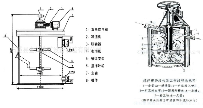 它使用于浓度不大于30%(按重量计算)固定成分的粒度小于1mm它的形式是平底桶形辐射循环螺旋叶轮机械搅拌式。 搅拌桶使用说明 使用前先紧固泵体部位螺栓,转动泵轴代轮是否灵活,然后开机运行,其它同浮选机。易损件:叶轮,定子。---拌桶结构