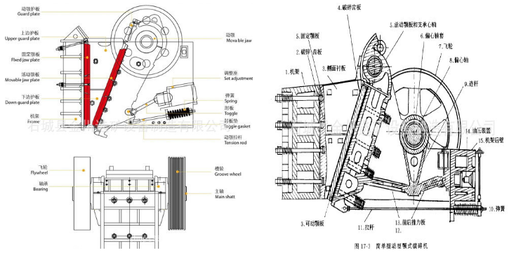 主要结构:机架、偏心轴、大皮带轮、飞轮、侧护板、肘板、肘板后座、调隙螺杆、复位弹簧、固定鄂板与活动鄂板等组成,其中肘板还起到保险作用。 该系列鄂式破碎机破碎方式为曲动挤压型。电动机驱动皮带和皮带轮,通过偏心轴使动鄂上下运动,当动鄂上升时肘板和动鄂间夹角变大,从而推动动鄂板向定鄂板接近,与此同时物料被挤压、搓、碾等多重破碎。当动鄂下行时,肘板和动鄂间夹角变小,动鄂板在拉杆、弹簧的作用下离开定鄂板,此时已破碎物料从破碎腔下口排出。